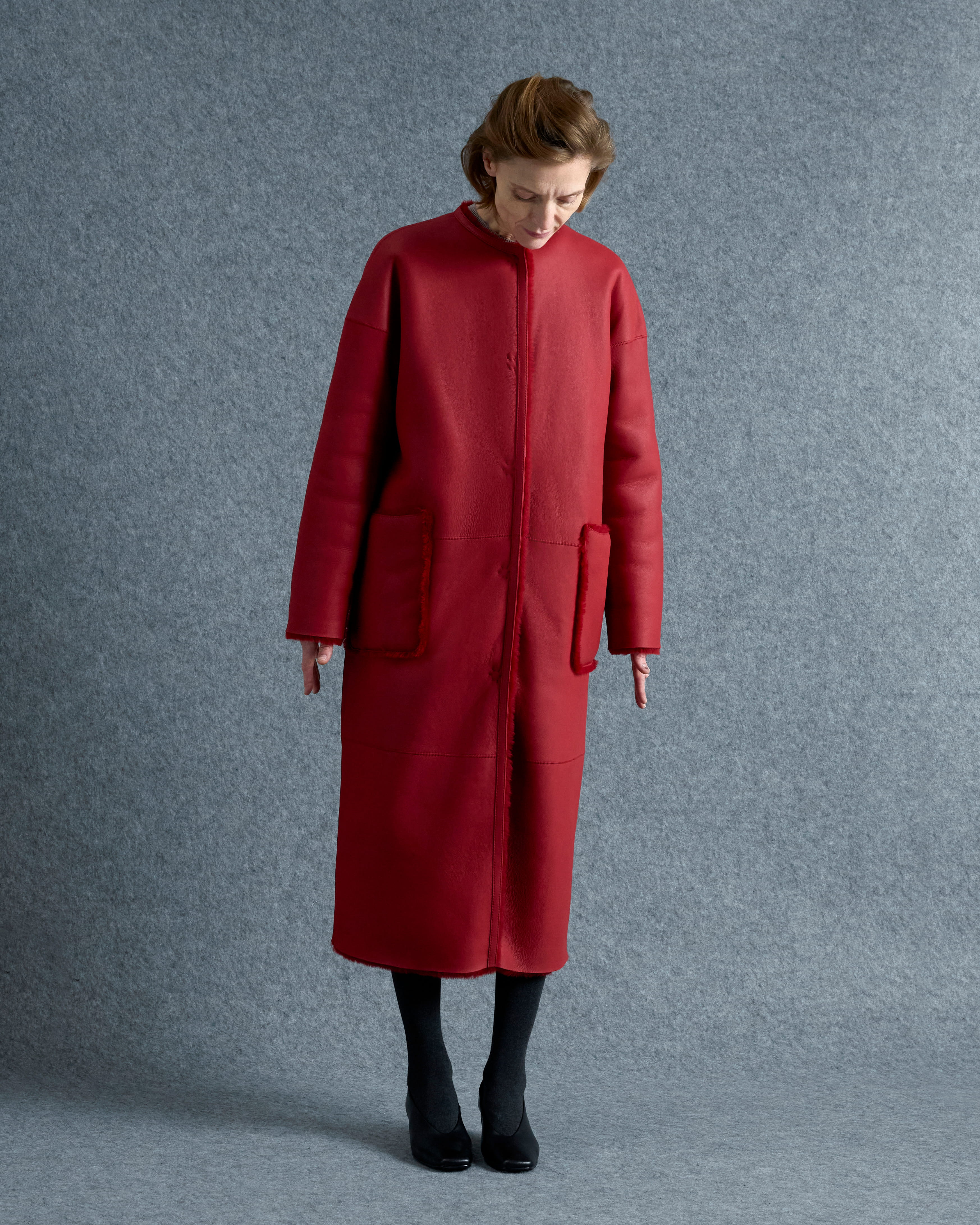 Двусторонняя однобортная дублёнка длины миди с прямым силуэтом без воротника. Модель выполнена из натуральной овчины с гладким мехом мерино и покрытием наппа. Широкий рукав со свободной линией плеча формирует расслабленный образ. Накладные карманы; со стороны меха карман закрывается металлической молнией. Застёжка — обтяжные кнопки в тон.