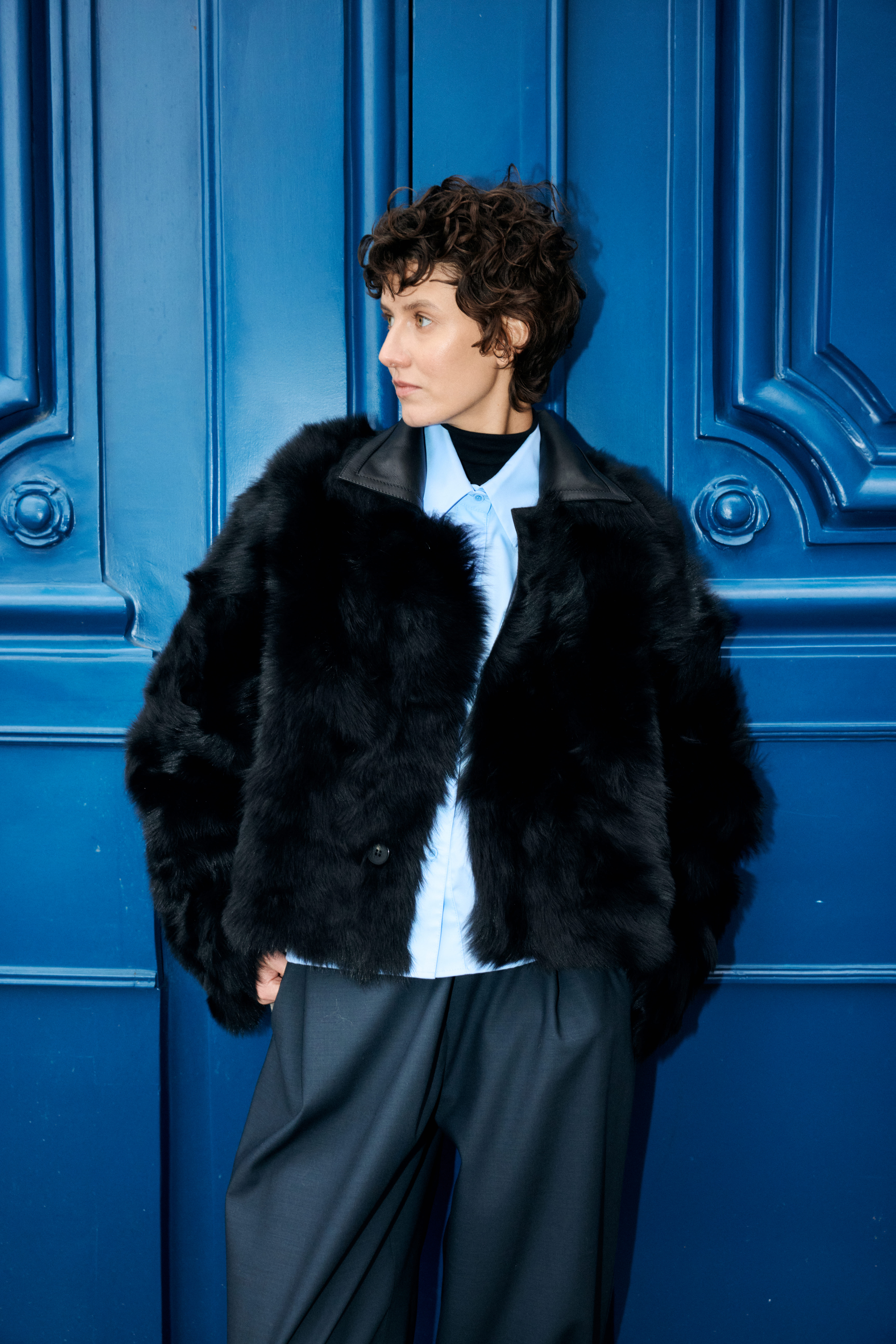 Двусторонняя однобортная дублёнка прямого кроя длины мини. Модель выполнена из натуральной овчины тоскана с покрытием наппа. Втачной рукав со спущенной линией плеча формирует мягкий, расслабленный силуэт. Воротник рубашечного типа. Застёжка — пуговицы.