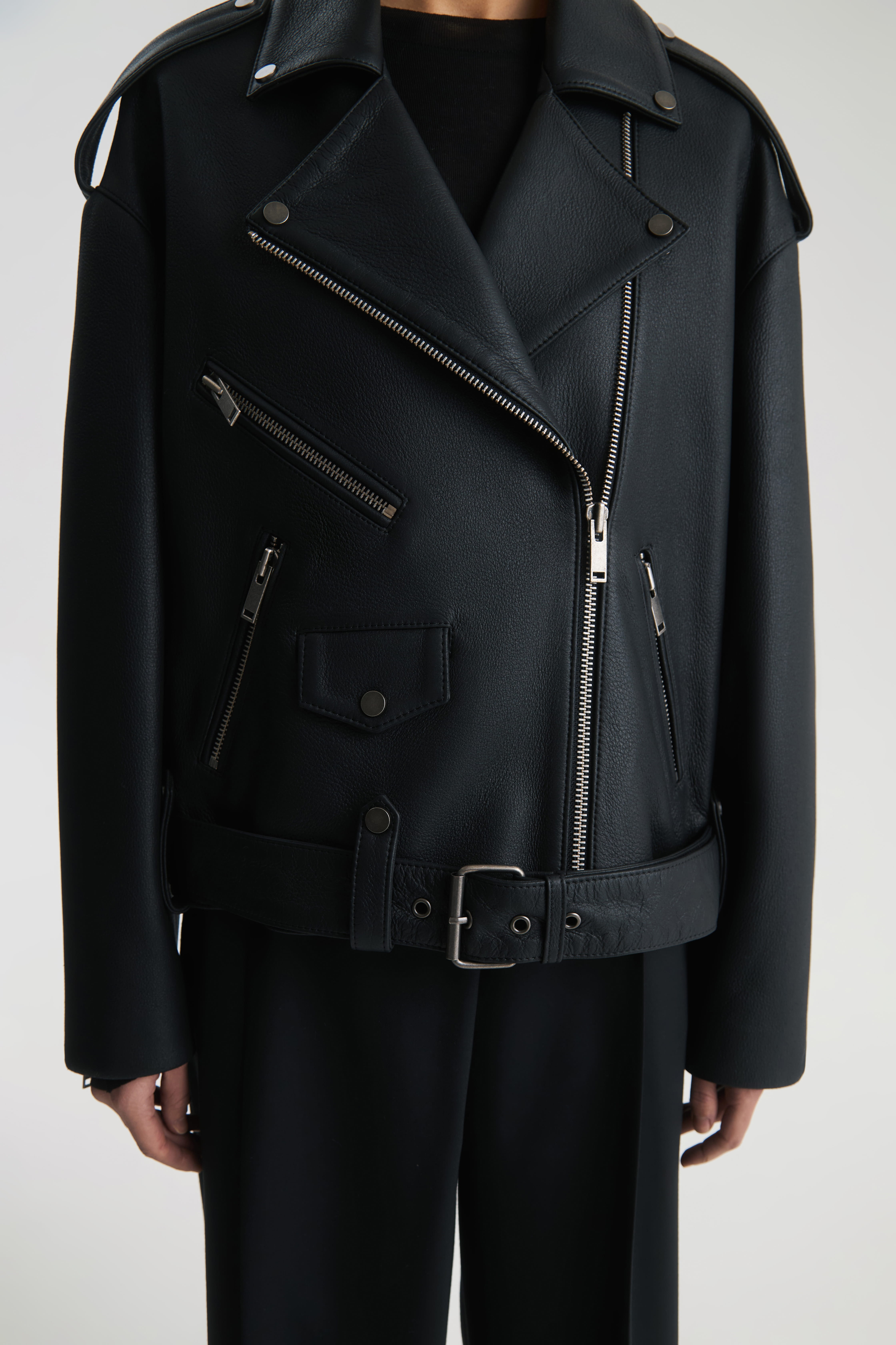 Кожаная куртка-косуха свободного кроя. Все элементы куртки - английский воротник, погоны на плечах, удлиненный рукав, карманы, ремень в шлевках - имеют металлическую фурнитуру в виде клепок и молний. Застежка - молния.