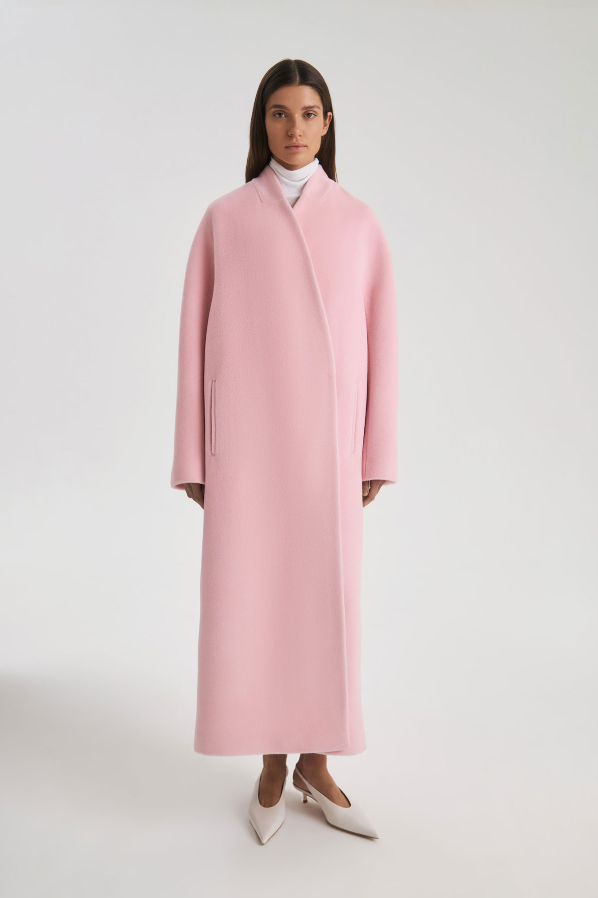 Пальто-халат на запах из мягкой ворсовой шерсти. Воротник-стойка плавно переходит в цельнокроеный широкий рукав, формируя цельный, архитектурный силуэт. Прорезные карманы. Шлица для свободы движения. Застёжка — потайная кнопка и внутренний тонкий пояс.