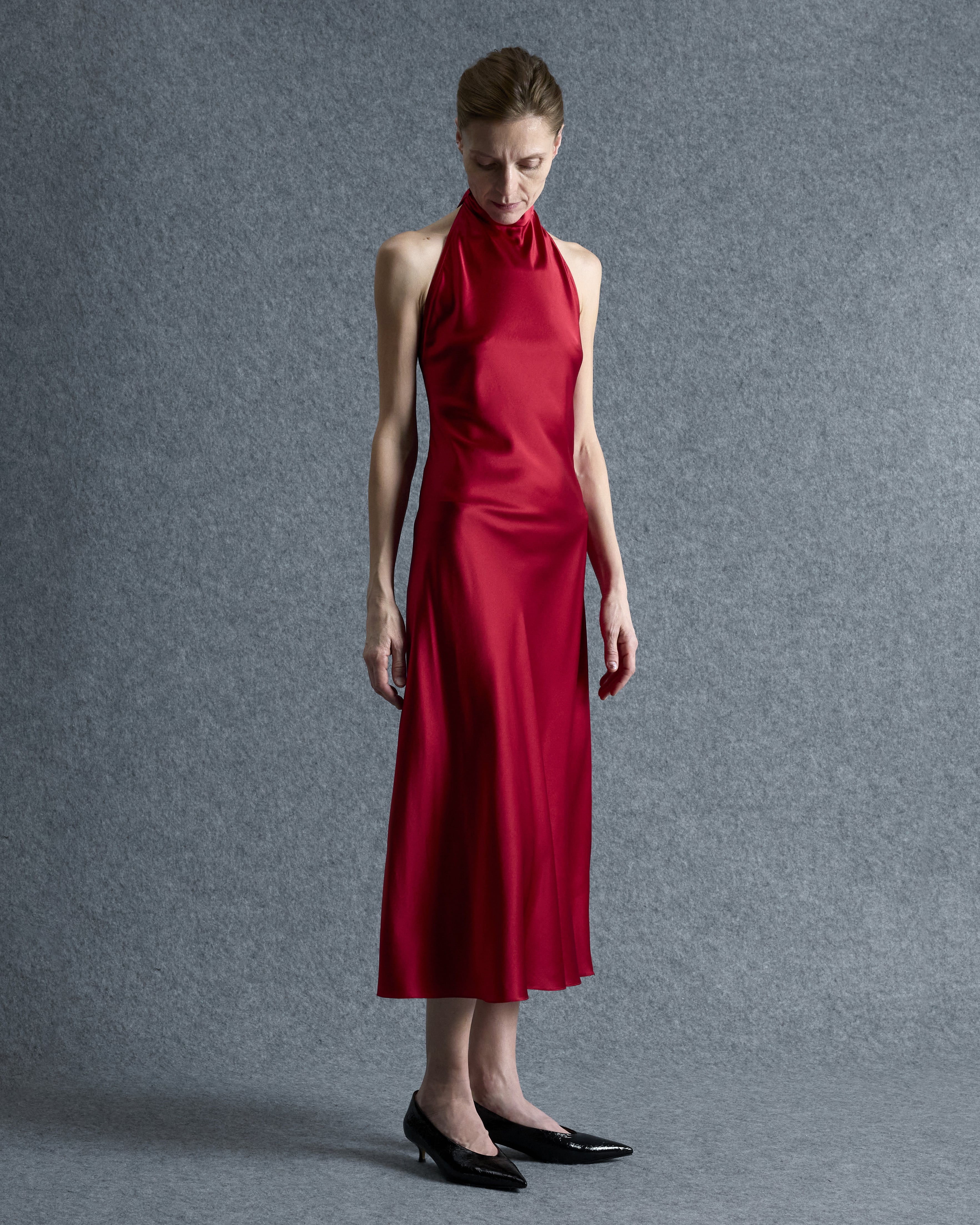 Шелковое платье миди с открытой спиной. Приталенный крой, слегка расклешенный силуэт. Завязки на шее, подчеркивают линию плеч и обеспечивают индивидуальную посадку. Потайная молния в боковом шве.